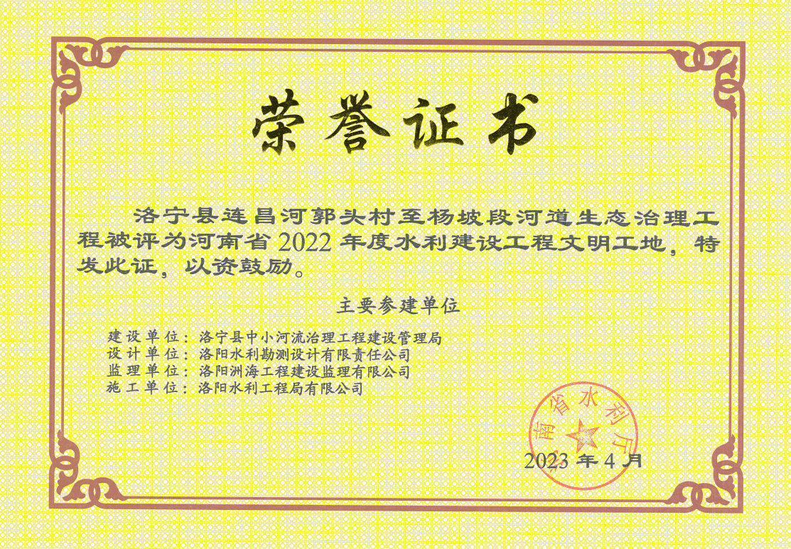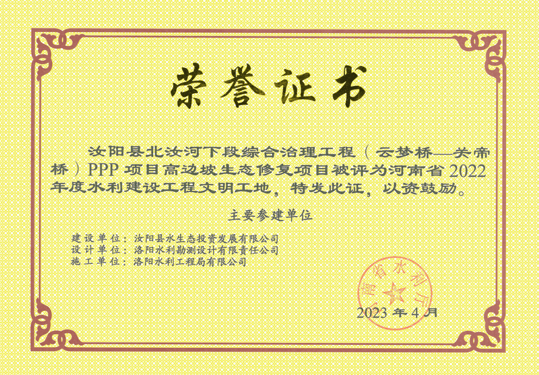 近段時間以來,公司喜訊連連,先后收到省水利廳、水利學會頒發(fā)的多份榮譽證書和獎杯。其中,洛寧縣連昌河郭頭村至楊坡段河道生態(tài)治理工程和汝陽縣北汝河下段綜合治理工程(云夢橋—關帝橋)PPP項目高邊坡生態(tài)修復項目2個項目被河南省水利廳評為河南省2022年度水利建設工程文明工地;洛陽市洛河東湖攔河壩工程喜獲河南省水利工程建設“紅旗渠杯”首批優(yōu)質工程榮譽稱號。